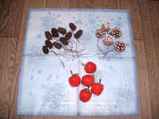 材料A 100円ショップ“キャンドゥ”で買ったものです。赤いりんご5個、まつぼっくり5個、ミニトーヒ10個です。りんごだけはぶら下げる用のひもしかついていなかったので、リースに取り付けるのには苦労しました。グルーガンがあれば簡単に付けることができると思います。 |