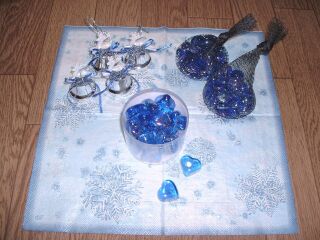 どれも100円ショップ“ダイソー”で買ったものです。真ん中のものは魚の形や楕円形の青いガラスの中に1つだけハートのものがありました。ラメっぽい青いガラスで23個入っていて、ぷっくりとしていて置いているだけでステキです。右のものはガラスのキャンドルフォルダーの底に敷き詰めたりしてもステキなので、おはじき状のラメっぽい青いガラスも2つ買いました。左のものはシルバーの鈴にトナカイがついていて青いリボンのアクセントのあるオーナメントはカード立てに使ってもいいなぁと思って買いました。 |