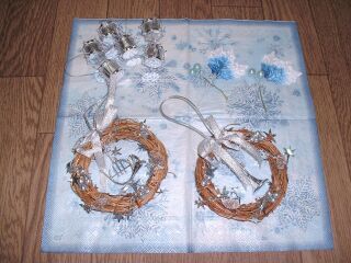 材料C ジャスコのクリスマスグッズのコーナーで88円で買ったものです。シルバーの太鼓6個、ホワイトとブルーのグラデーションのヒイラギ3枚とブルーの実2個です。 |
