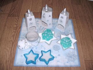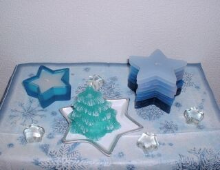どれも100円ショップ“ひゃくえもん”で買ったものです。ろうそくの形をしていて星やもみの木にくり貫いてあるところがステキです。普通のお店で買うともっと高いです。ブーツの形のものもあります。真ん中にあるのは星のお皿にもみの木のキャンドル付きです。一番下のものは青い星のキャンドルフォルダーです。 |