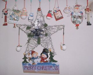 愛嬌のあるサンタクロースと白くまのオーナメントの増えたディスプレイです。昨年はポストカードをたくさん貼りましたが、今年はしませんでした。 |