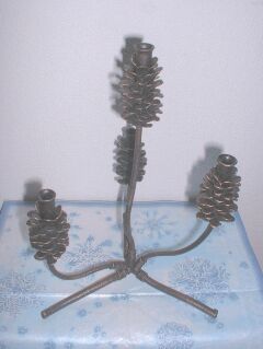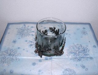 まつぼっくりのキャンドルフォルダーと100円ショップ“ひゃくえもん”で買ったキャンドルフォルダーの組み合わせです。“Kitchen Kitchen”で買ったシルバーの丸いキャンドルは100円ショップ“ダイソー”で買った青いミニワイングラスにぴったりでした。 |