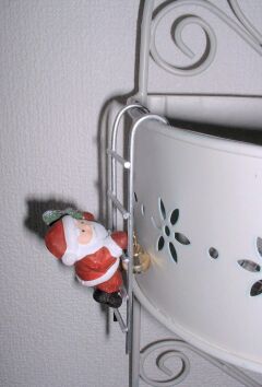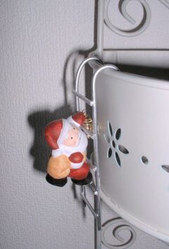 伊丹にあるテラスの中の“One's”で買いました。よく街のデパートにぶら下がっているサンタクロースのミニ版みたいでとってもかわいらしいです。左手にもみの木を持って、右手に鈴を持っています。買うときはどこにぶらさげようかと悩みましたが、ちょうとスパイスラックにかけるといい感じになりました。250円でした。 |