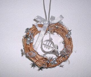 ジャスコのクリスマスグッズコーナーで買いました。直径10cmほどの小さいクリスマスリースですが、シルバーと楽器(トランペット)とミニトーヒの組み合わせのオーナメントに惹かれて買いました。値段も88円と魅力的です。 |