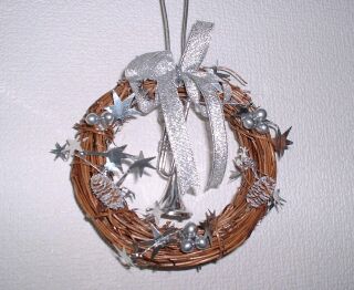 100円ショップ“ダイソー”で買ったものです。昨年は赤い星のリーズを買ったのですが、今年は青色の星のリース を見つけたので迷わず買いました。シルバーによくあっていて大人っぽい感じがします。 |