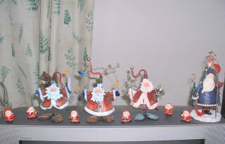 楽団のサンタクロース6人とブリキのサンタクロース3人と今年加わったまとめ役のサンタクロースのディスプレイです。これ以上増えたらここには置けません。 |
