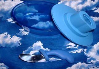 2002年に行った東京の雑貨屋san巡りで自由ヶ丘にあるキッチン用品のお店「Units」で買ったものです。お皿やお鍋に残ったソースをきれいに取って洗い物が楽になります。いろんな色があり、濃いブルーもあったのですが、小林カツ代sanの生活提案の方の水色にしました。使った後は目の部分にS字フックをかけて乾かします。450円でした。 |