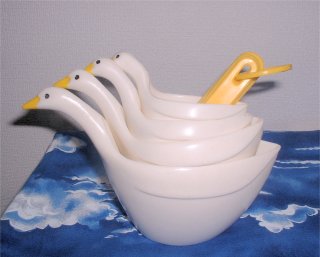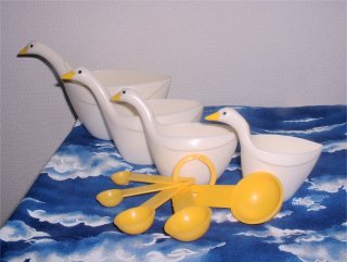 アヒルsan4羽それぞれが計量カップになっていて、全部ひとつに収まるようにできているのです。1カップ、1/2カップ、1/3カップ、1/4カップと計量スプーン5個(大さじ1、大さじ1/2、