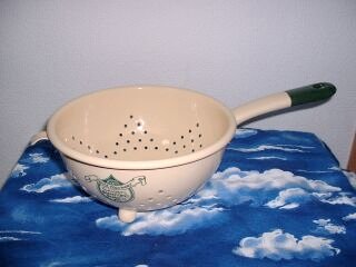 ネットショップの「カントリー生活工房 wood-session」のセールで買ったものです。倉敷意匠のもので色と形に惹かれました。洗った野菜の水切り、こんにゃくの下ごしらえやゆでた麺類の水切りなど大活躍で、ホーローで出来ているのでさっと洗ってお手入れも楽です。 |