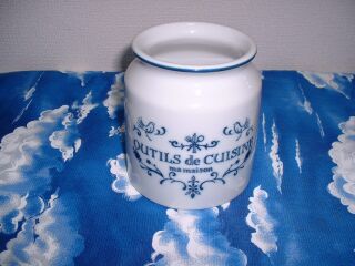 すぐに使うキッチングッズは壁にぶら下げて使っているので、あまり使わないものを立てて入れています。ヘンケルスのキッチンバサミ、湯豆腐のお玉、果物用ナイフ、すりこぎなどです。 1200円でした。 |