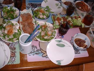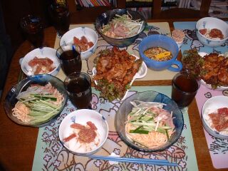 【簡単ビビン麺】 ★材料★ 焼き豚の薄切り 8枚(細切り) きゅうり 2本 長ねぎ 1/2本(5cm→千切り→水にさらししらがねぎにする) うどん(乾麺) 400g キムチの素 大4 ★作り方★ @たっぷりの湯でうどんをゆで、冷水で洗って水をよく切り、ボウルにキムチの素を入れからめる。 A@を器に盛り、焼き豚、きゅうり、しらがねぎをのせる。 |