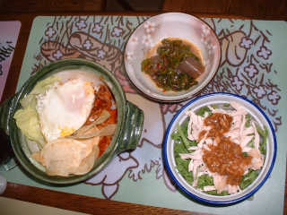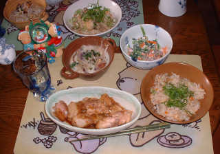 【鶏肉のバンバンジー】4・10 ★材料★ 鶏胸肉 1枚 味の素 少々 塩 少々 酒 小1 ≪タレ≫ 長ネギ 5cm(みじん) しょうが汁 小1 ピーナッツバター 大21/2 砂糖 大1 しょう油 大11/2 酢 大1/2 ごま油 小1 春菊 1把(一口大にちぎる) ★作り方★ @鶏肉は下味をまぶしてよくなじませ、ラップをかけ500Wの電子レンジで約2分加熱し、1分休ませてから、さらに約1分半加熱する。そのまま冷まして空手で細く裂く。 Aタレをよく混ぜ合わせ、皿に春菊、鶏肉を盛り、タレをかける。 |