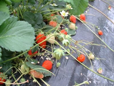 時々葉っぱの陰に隠れているいちごもある。それぞれ自分の通路を決めて取りながら歩いていくのだが、どうしても |