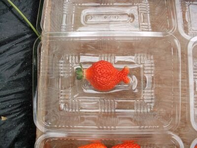 採り終えたいちごを青いケースに入れていく。 |