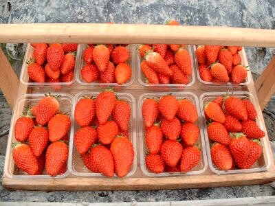 パックに入れたいちごを8個ずつ、取っ手のついた木のケースにのせて運ぶのだが、運ぶよりももぎ取る時間のが早いので |