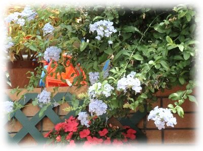 薄い水色のつる性植物。何本も垂れ下がっていい感じ。今、一番欲しいお花。 |