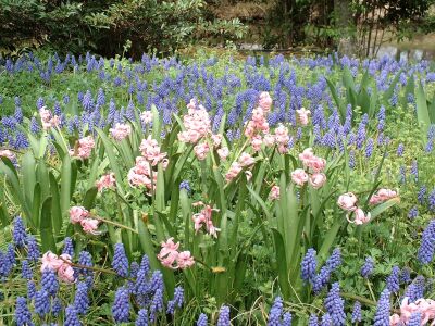 ムスカリの群生とその中にある淡いピンクのヒヤシンスは幻想的。 |