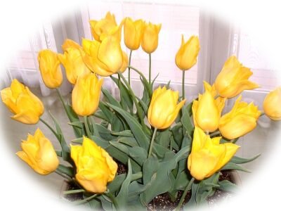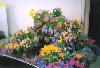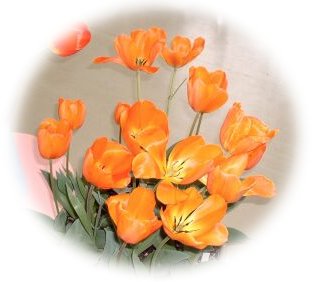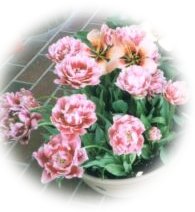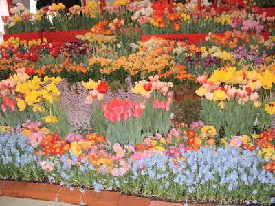 黄色のチューリップとオレンジのスカシユリと青いヒヤシンスのコントラストがはっきりしていて、 |