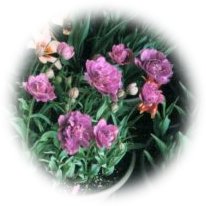 濃い紫の八重咲き。ボタンのよう。 |