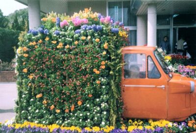 オレンジ色の車に寄せ植えされた色とりどりのシューリップとヒヤシンス。側面はハートの寄せ植えになっている♪ |