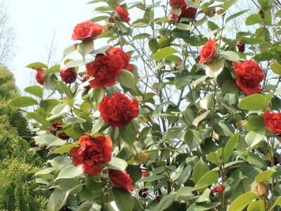 最後に出口の所に咲いていた。黒味を帯びた赤の八重の椿。 |