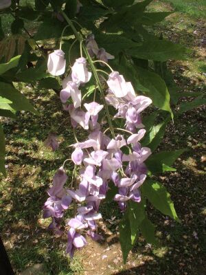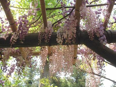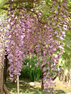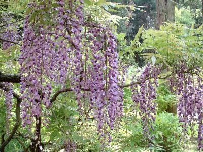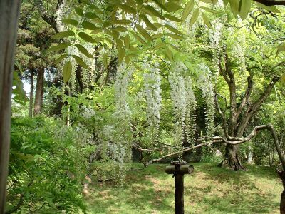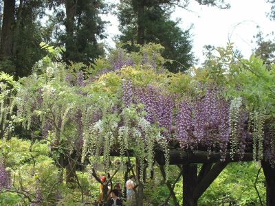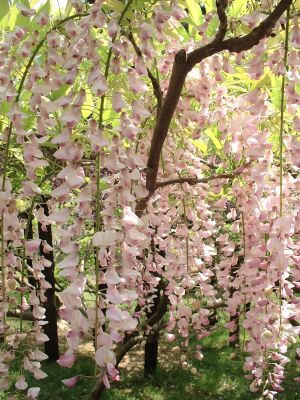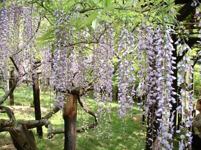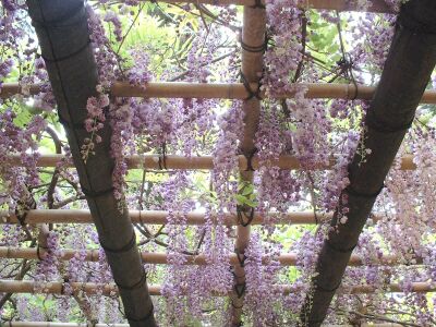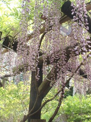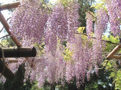 名前のとおり、とっても長い藤。9尺ということは2m70cm。青白い感じの薄い紫。本当に間近で藤と藤の間をくぐると幸せ。 |