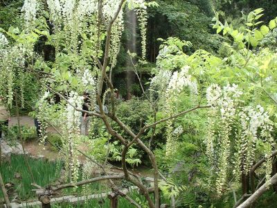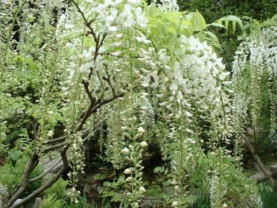 まだこれから咲く蕾がたくさん。垂れた感じがわっと湧き出るシャワーのよう。透明感のある白。白い藤の中でも一番好きかも。 |