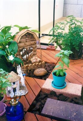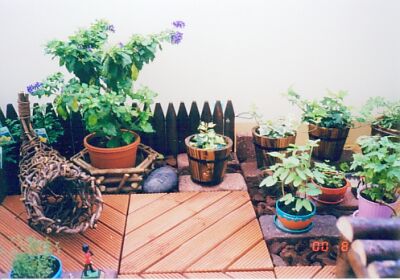 ガーデニングを始めた頃のベランダです。ウッドデッキ、オーストラリアレンガ(サンセット、ビショップ)を敷き詰め、植物もグリーンしかありません。 写真もこの頃はデジカメを持っていなかったので、スキャナで取り込んだものです。今のベランダから思うと、なんだかすっきりしています。