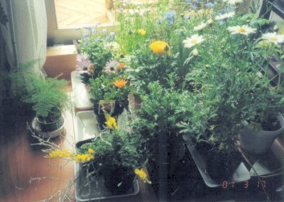 | 部屋の中で春を待つ、待機中の花たちです。もうたくさんありすぎて狭い部屋の中がジャングルのようになっています。白いのはマーガレット、黄色のはラナンキュラスです。手前にある黄色いのはエニシダです。 |