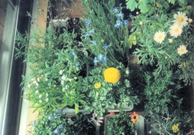 部屋の中で待機中の花たち。上から撮ったところ。 花が咲いていない葉っぱだけのものは、冬の寒さに弱いアメリカンブルーとイソトマブルーです。部屋の中でどんどん葉を茂らせています。 |