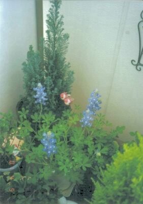 シルバー色のコニファーの前にあるのは水色のルピナスです。ぶどうの房のように次々に咲いてくれます。赤ちゃんの手のような葉っぱもとても好きです。 |