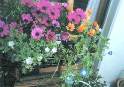 紫色のディモルフォセカとオレンジ色のディモルフォセカが満開です。ぱっと広げた花びらがひまわりのように元気いっぱいで、黒い花の芯がアクサントになっています。 その手前にあるのが白い花に紫の縁取りが入ったネモフィラ:マラクタと水色のネモフィラ:インシニグスです。いろんな方向に茎が伸びて、のびのびとしていて、5つの花びらがとてもかわいらしいです。 アイリスオーヤマからでている受け皿つきのワイヤーハンギングネットにポット苗のまま並べて、木の椅子にかけています。