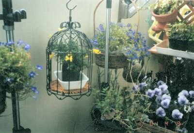 青銅色の鳥かごはよく見かけるのですが、黒のアイアンでできた鳥かごが気に入ったので、迷わず買いました。 1つぐらいしか苗は入れることができないので、エニシダを入れてみました。レモン色で、スイトピーのような小さな花がかごからぴょんぴょんと飛び出して、かわいらしい感じです。 |