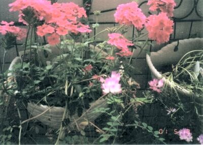 紫がかった色とブルーのトレニアです。ラッパのような花の形が大好きです。咲き終わった後は1つ1つ花がら摘みをすれば、どんどん蕾を作ります。 左端にあるのはギリシアで買ったミニの風車です。風が吹くとちゃんと回ります。 |