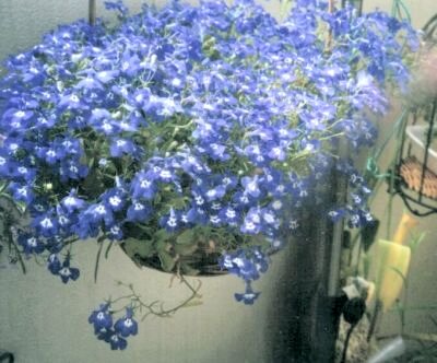 去年の秋に買ったロベリアがかごいっぱいに咲いています。2株だけとは思えないほどびっしり咲いています。 |
