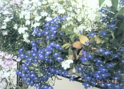 | 新たにブルーと白とピンクのロベリアを買いました。ちょうちょのような花が室外機の上の棚を覆い尽くしています。こぼれるような感じで花と花の境目がわからないほどです。 |