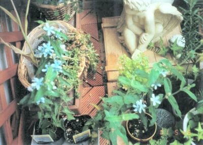 下に置いた籠の中のチューリップもビオラも終わり枯れてちょっと見苦しいです。 切花で好きなオキシペタラム・ブルースターの苗が売っていたので買いました。ベルベットのような花の質感で星型の花が咲きます。なんといっても水彩画のような水色がステキです。 |