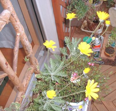 しばらくたってから咲きはじめたユリオプスデージーです。次々に咲いて、咲いたらしばらく長い間咲いているので、寒いベランダがぱっと明るくなります。 |