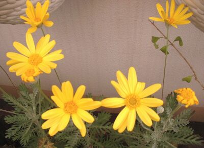 | 藤のカゴに植えていたユリオプスデージーが枯れてしまったので、一番よく出回る11月頃から、買うことを決めて探していました。買ったばかりのユリオプスデージーです。1株100円だったので3つ買いました。シルバーがかった色で切り込みのある葉とレモン色の元気なお花は大好きです。 |