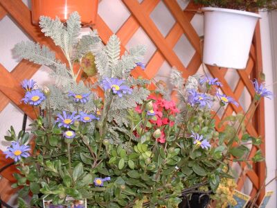 | シルバーレースとピンクの初恋草とブルーデージーの寄せ植えです。寄せ植えといってもハンギングプランターに苗のポットのまま並べて入れているだけです。Autumnの写真から比べると全体的に茎が伸びてきて、ブルーデージーが次々に咲いています。 |